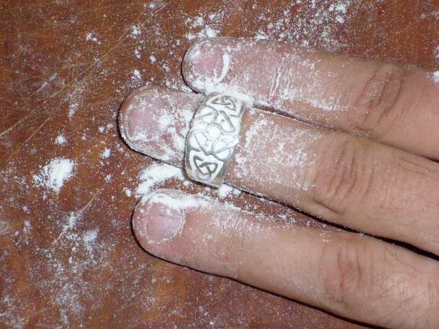 Walthers Ring nach dem Teigkneten. Interessant, auf welche Weise Mehl Ornamente hervorheben kann. :-)