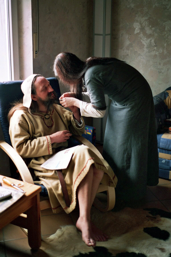 Ava beim Einflechten von Heyos Bart.