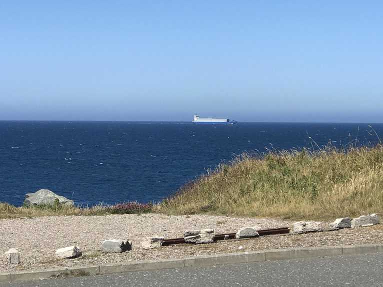 Das erste große Schiff, das wir hier an der Küste sehen: Die Rotra Vente aus den Niederlanden auf dem Weg nach Cuxhaven. Das ist ein spezielles Schiff für den Transport von Bauteilen für Windkraftanlagen.