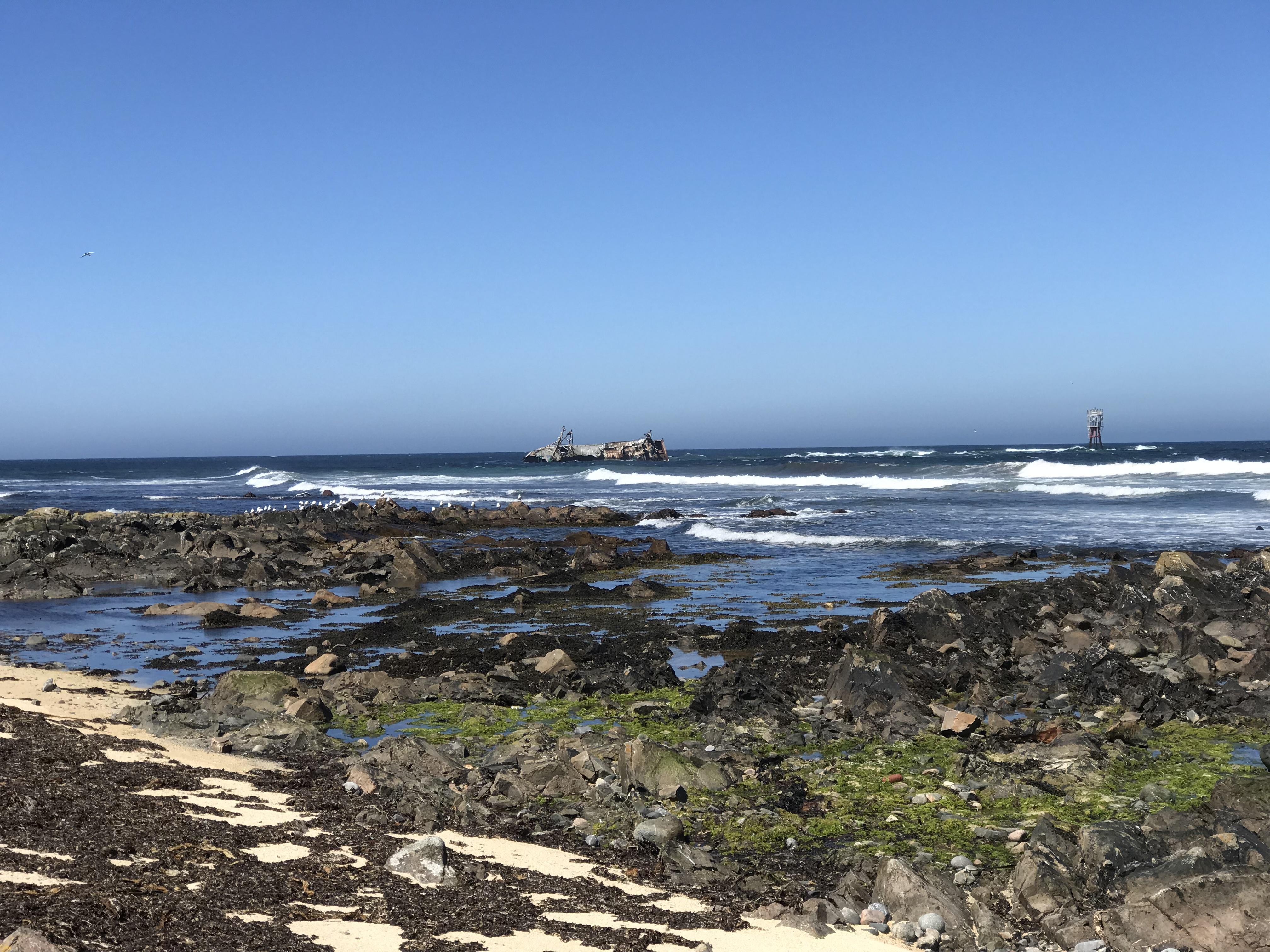 Bei Cairnbulg: Im Leuchtturmmuseum hatten wir erfahren, dass hier ein Schiff gestrandet ist. Im Hintergrund das Wrack.